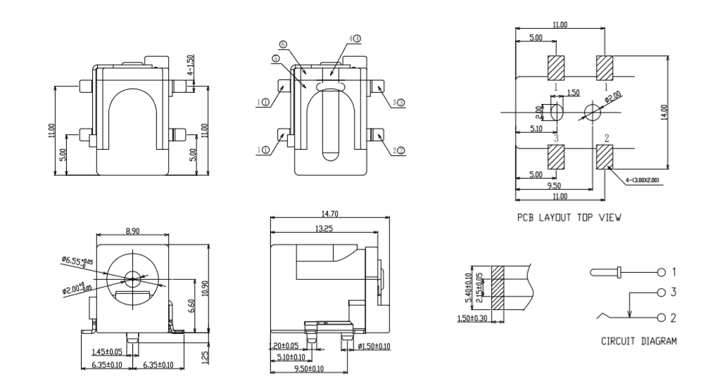 DC050TФ6.4 针芯/φ2.5/2.0/3.0(14.7*9*11)全贴片DC电源插座